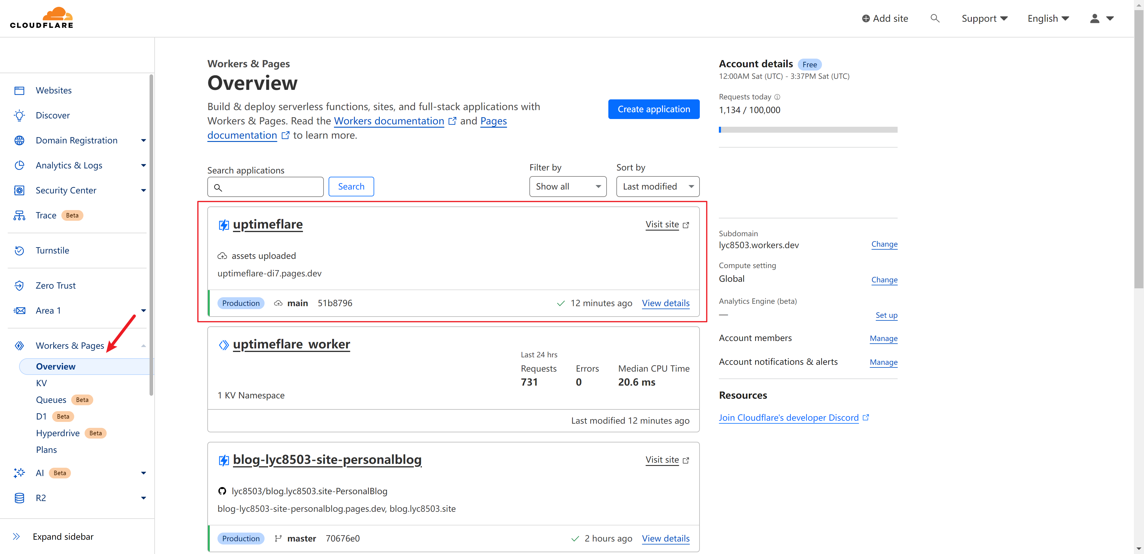 Workers & Pages中看到状态页面部署完成